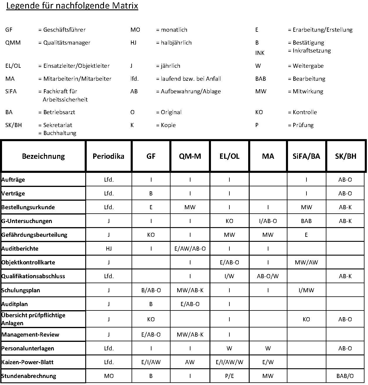 Die Erstellung, Sammlung, Übergabe und Aufbewahrung ist in nachfolgender Reihenfolge vorzunehmen und aus nachfolgender Matrix zu ersehen: